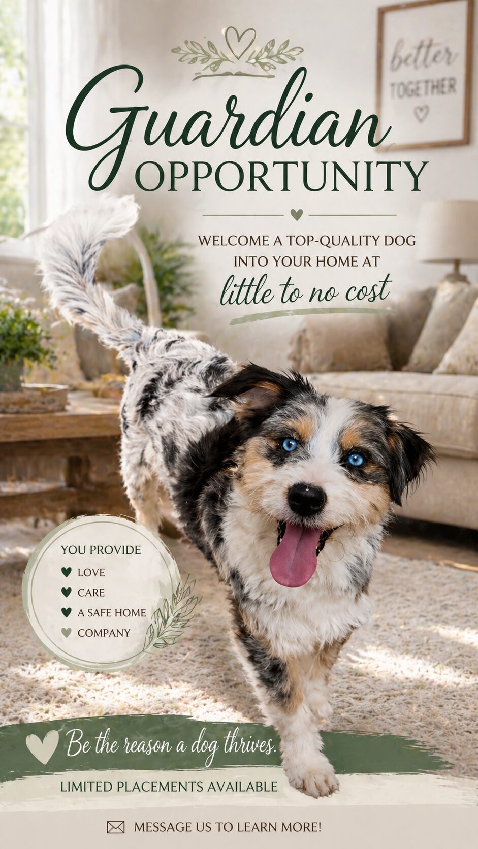If you're interested in adopting a retired adult, please reach out! We match each dog with the home that best fits their personality and needs.